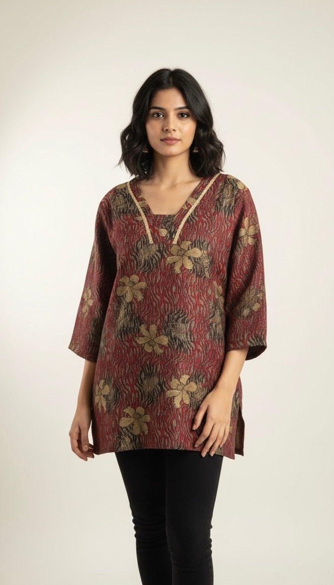 Crafted from a soft and cozy pashmina wool blend, this short-length kurti combines comfort with chic floral design.