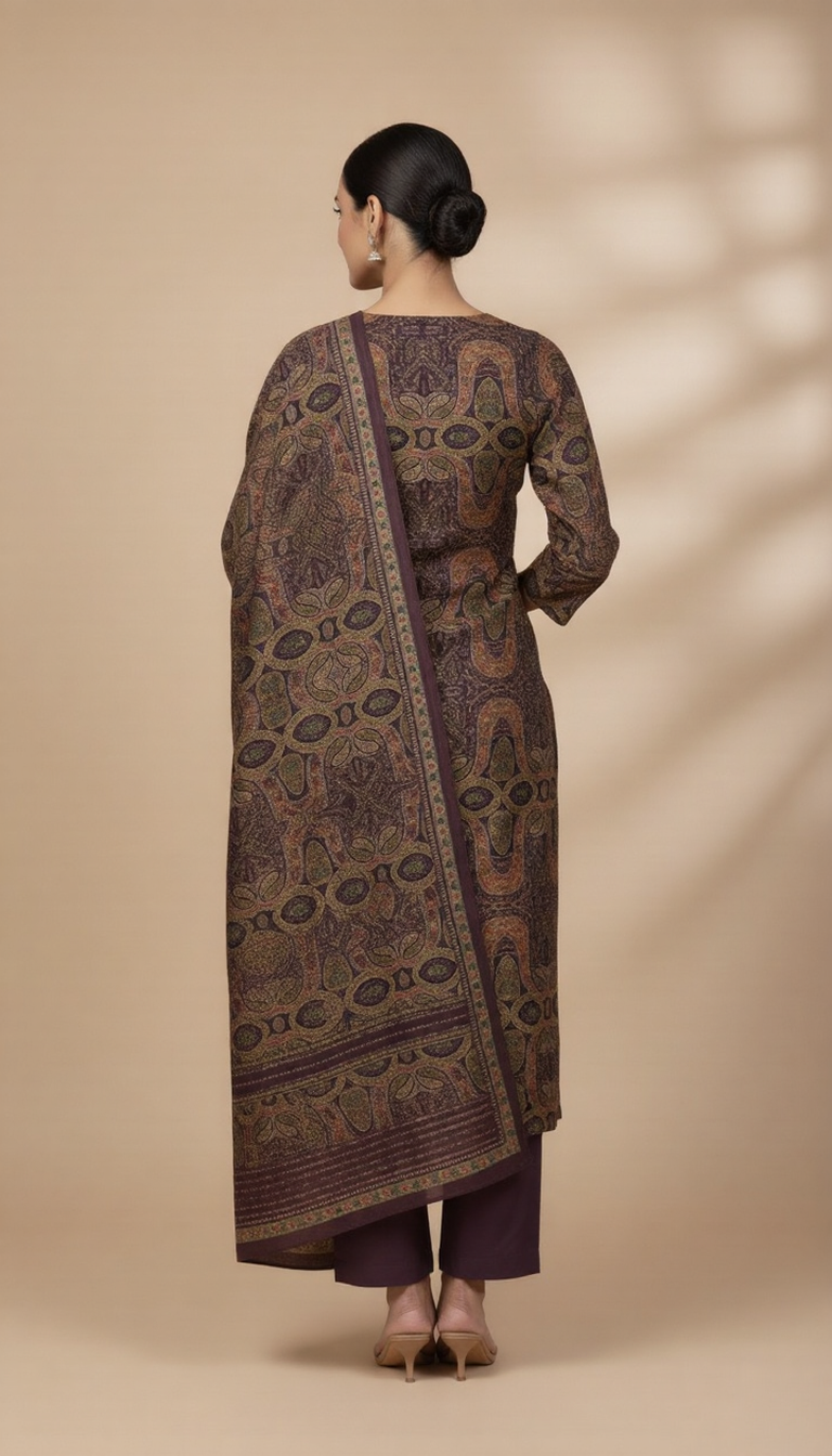 A luxurious winter 3-piece pashmina set featuring elegant Kashmiri motifs, a soft warm feel, and a beautifully detailed neckline — perfect for premium winter style.